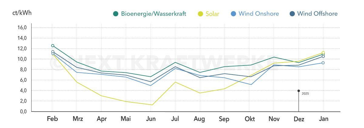 Auch die Windenergie profitierte von den winterlichen Bedingungen. Der Marktwert für Wind an Land erhöhte sich gegenüber dem Vormonat von 8,349 ct/kWh auf 9,536 ct/kWh, was einem Plus von 14,2 Prozent entspricht. Noch dynamischer entwickelte sich die Offshore-Einspeisung: Der Marktwert für Wind auf See sprang von 8,608 ct/kWh im Dezember auf 10,519 ct/kWh im Januar und legte damit um 22,2 Prozent zu. Erneut im Aufwind befand sich auch die Photovoltaik. Obwohl ihr Anteil an der Stromerzeugung im winterlichen Januar naturgemäß gering blieb (3,7 Prozent der Monatsproduktion), stieg der Marktwert Solar von 9,373 ct/kWh auf 11,019 ct/kWh – ein Anstieg um 17,6 Prozent.